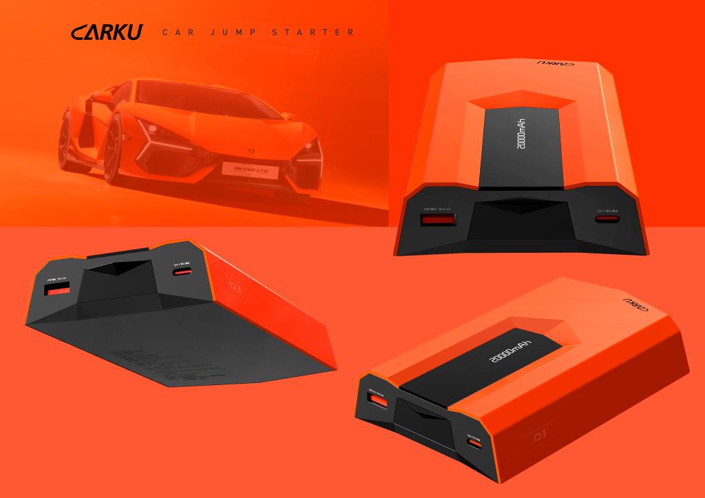 该设计项目是公司文化旅游与文创产品开发工作室设计的汽车应急启动电源。汽车应急启动电源是一种多功能便携式移动电源,主要用于汽车亏电或其他原因无法启动时提供电力支持,同时具备充气泵、户外照明等功能。该设计采用超级跑车兰博基尼的设计风格,通过斜切的手法让产品功能合理布局,硬朗浑厚的造型让电源充满立体感、力量感、现代感,橘黄色的外壳让电源充满活力能量,和启动电源的功能相契合。