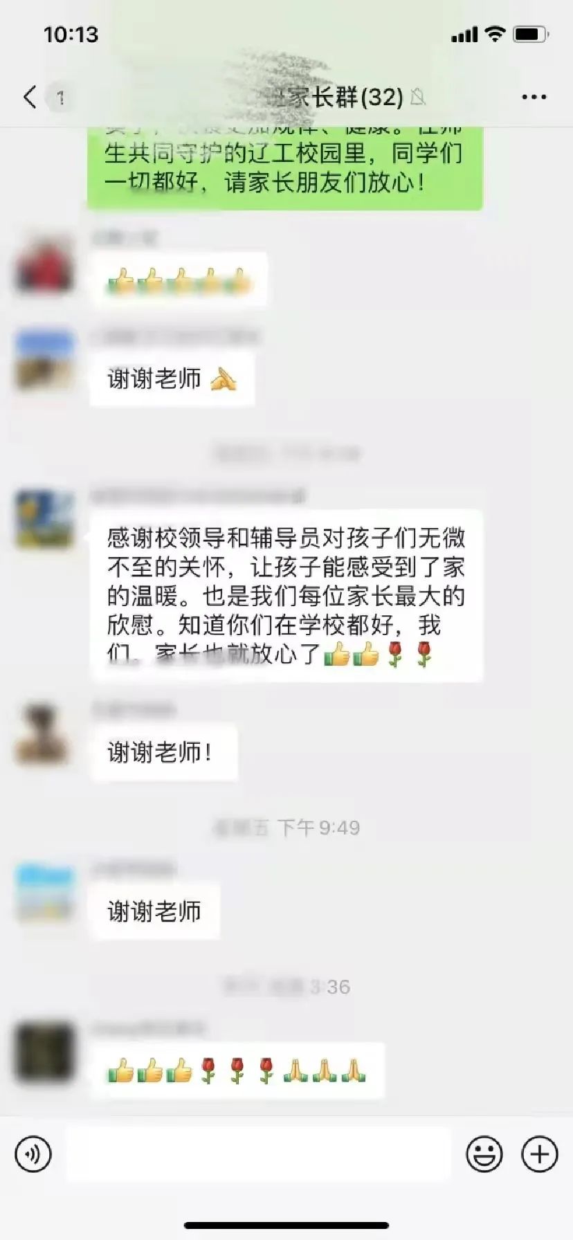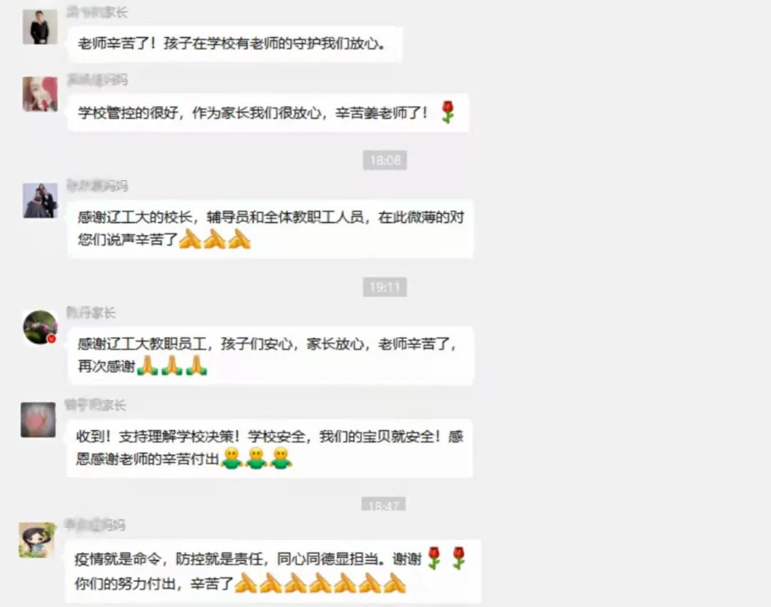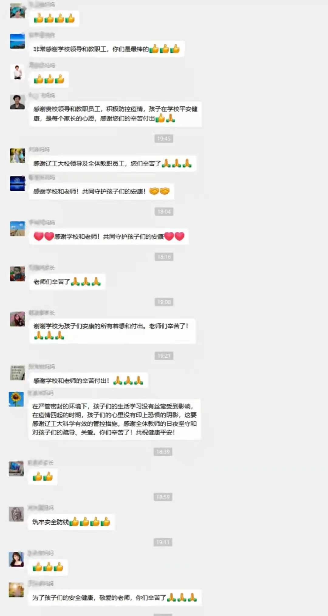 “在严管密封的环境下,孩子们的学习生活没有受到丝毫影响,在疫情四起的时期,孩子们的心里没有印上恐惧的阴影,这要感谢辽工大科学有效的管控措施,感谢全体教师的日夜坚守和对孩子们的疏导、关爱。你们辛苦了,共祝健康、平安。”