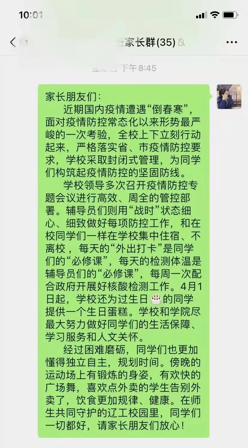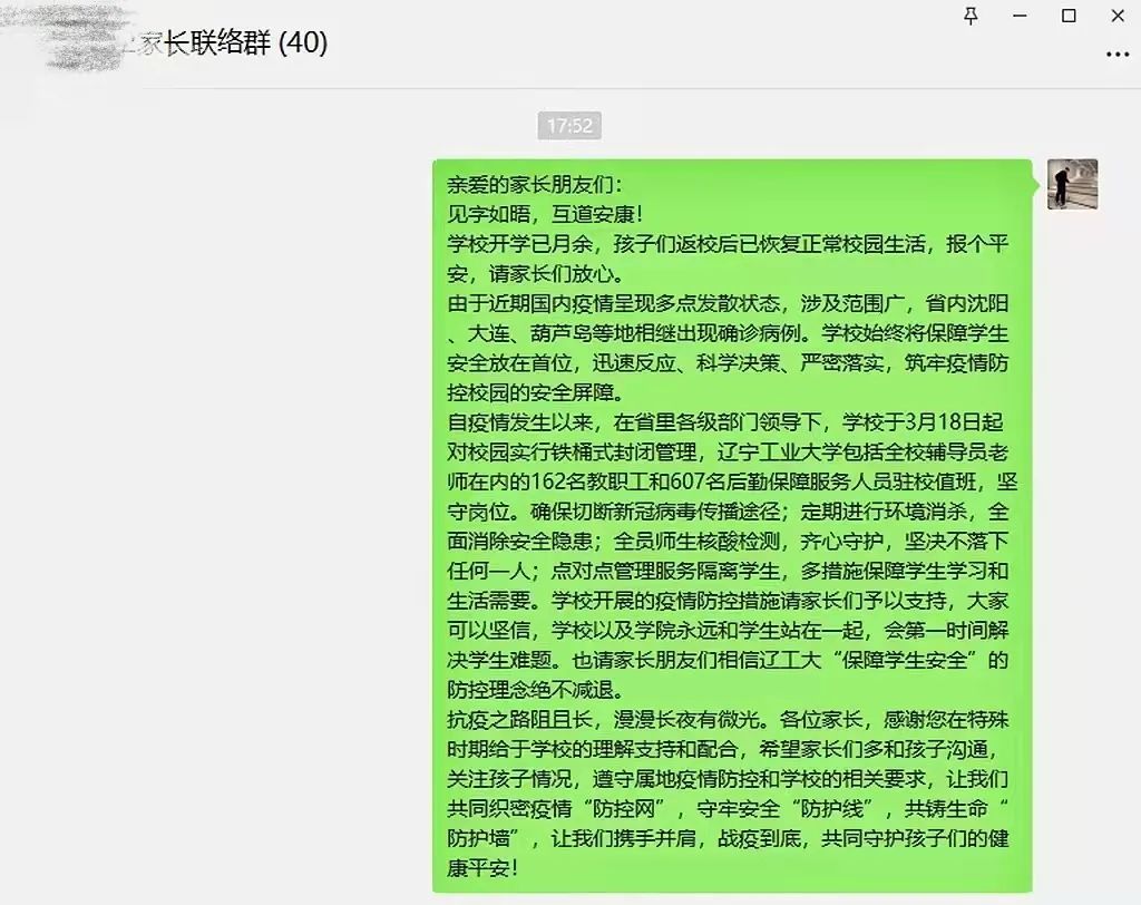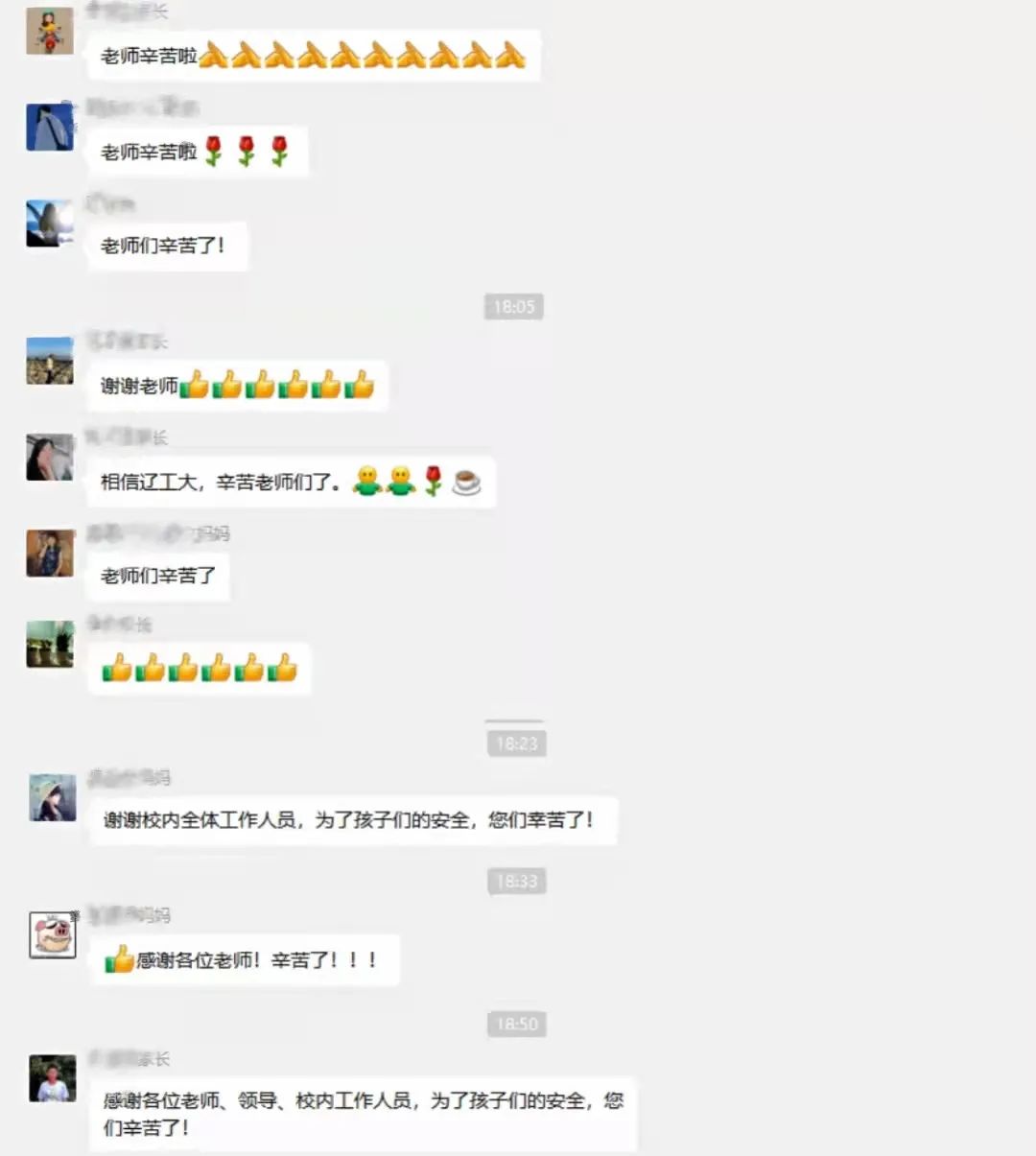 “在严管密封的环境下,孩子们的学习生活没有受到丝毫影响,在疫情四起的时期,孩子们的心里没有印上恐惧的阴影,这要感谢辽工大科学有效的管控措施,感谢全体教师的日夜坚守和对孩子们的疏导、关爱。你们辛苦了,共祝健康、平安。”