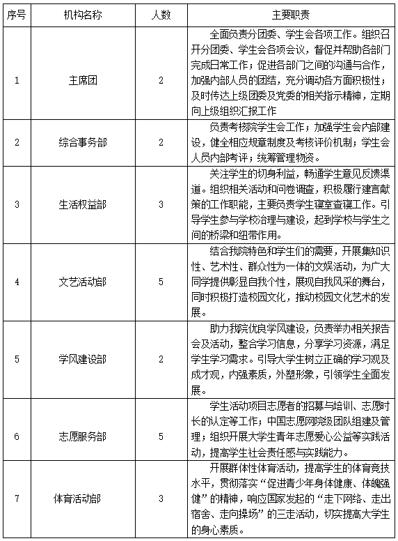 1.遵循和贯彻党的教育方针,组织同学开展学习、文体、社会实践、志愿服务、创新创业创优等多种活动,促进同学全面发展;