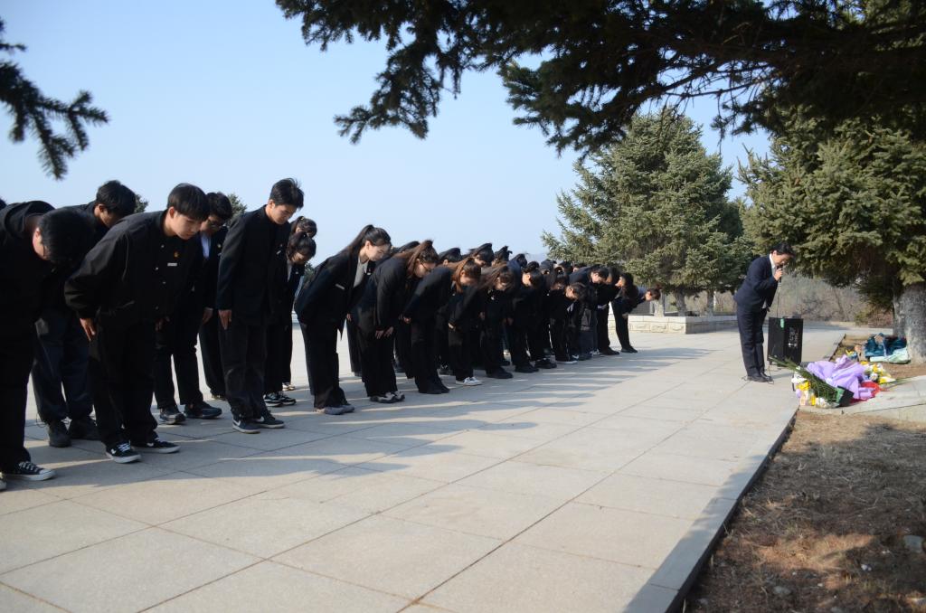 此次祭扫活动邀请到解放锦州烈士陵园讲解员李露露老师。在无名烈士墓前,李露露老师为同学们带来了一节震撼人心的沉浸式微团课,伴随着鲜活的语言和现实场景以及解说员生动的讲述,再现了那段风雨飘摇的火红岁月,重温了革命先烈为民族解放舍身忘死的光辉事迹。全体师生向无名烈士墓三鞠躬表达深切的哀思和崇高的敬意。