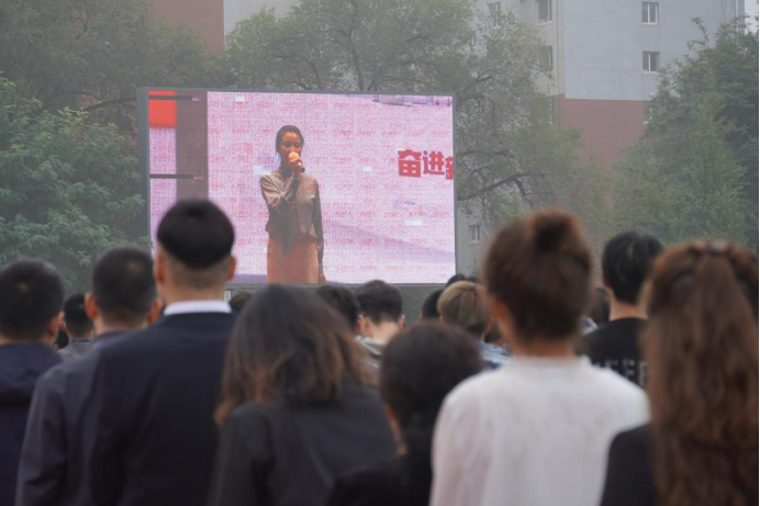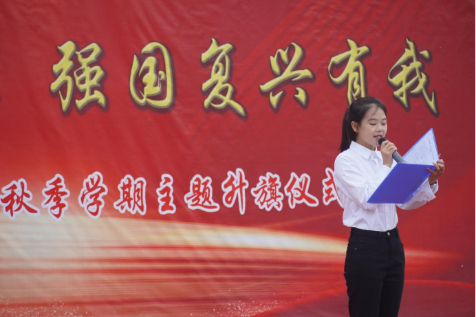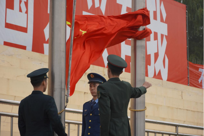7时10分整,升旗仪式正式开始。伴随着激昂雄壮的 《义勇军进行曲》,鲜艳的五星红旗冉冉升起。全体师生整齐列队、庄严肃立,向国旗行注目礼,国旗飘扬、心潮澎洴,心中满怀着对祖国的热爱之情和美好祝福,共同祝愿伟大祖国繁荣昌盛、国泰民安。