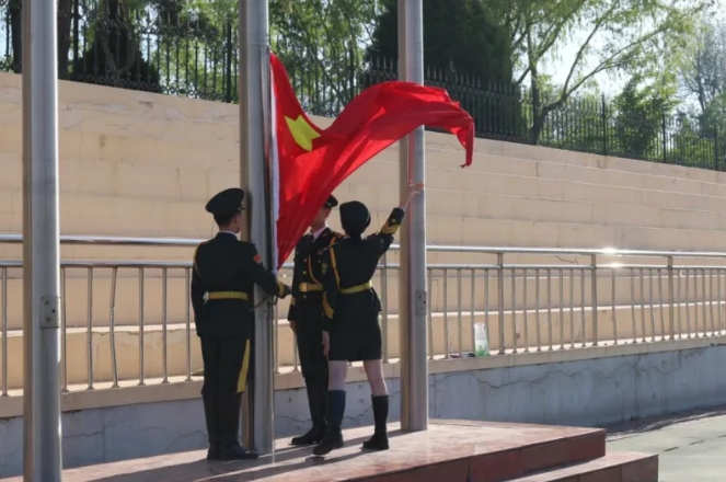7时10分整,升旗仪式正式开始。伴随着激昂雄壮的《义勇军进行曲》,鲜艳的五星红旗冉冉升起。全体师生整齐列队、庄严肃立,向国旗行注目礼,国旗飘扬、心潮澎湃,心中满怀着对祖国的热爱之情和美好祝福,共同祝愿伟大祖国繁荣昌盛、国泰民安。