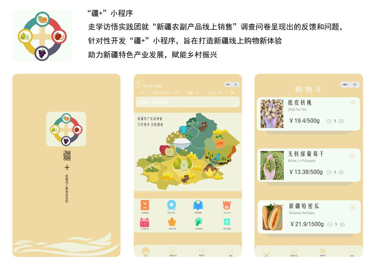 同学们就新疆农副产品销售情况等问题,通过线上线下发布调查问卷,实地走访调查水果种植户,总结供需过程中存在的问题和反馈。在此基础上发挥自身传媒设计专业优势与特点,依托新媒体平台,开展直播助农活动,帮助农户销售产品。另外设计开发“疆+”小程序,实现拓展销售渠道,为乡村振兴、特色产业发展蓄能助力。