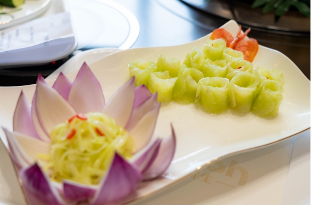 “两秀青莲” 巧妙搭配青笋、圆葱等常见平价食材,主材青笋烹制酸辣和咸鲜两种口味,紧扣“两秀”涵义,分别盛放于以紫色圆葱雕刻的莲花和盘面之上,点缀小米辣、西红柿等,寓意 “廉洁奉公,清白立世”。菜品口感清新,造型优雅,色彩搭配和谐,寓意深刻,生动展现了清廉主题。