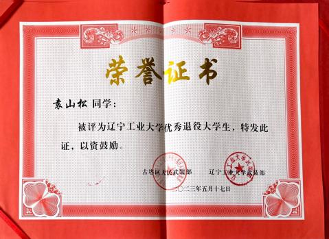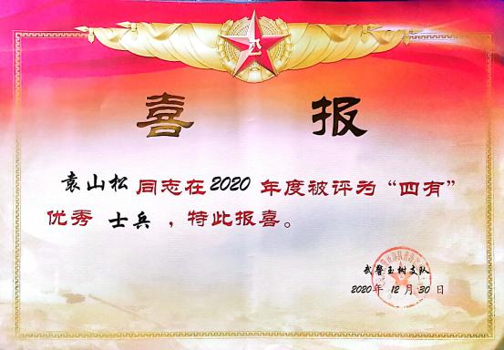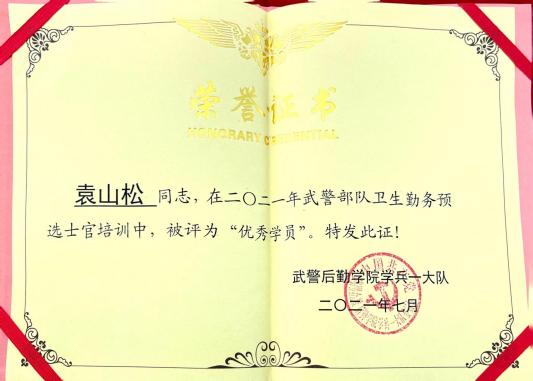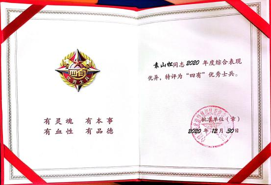 2019 年-2021年服役期间获得“优秀学员”、“四有”优秀士兵、“支队嘉奖”、“优秀射手”(“四有”优秀士兵兼得“支队嘉奖”,“优秀射手”未发证书)
