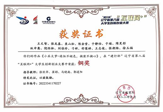 3.2022 年 9 月获辽宁省第八届建行杯“互联网+”老员工创新创业大赛省级铜奖;