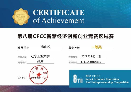 2022 年 9 月获辽宁省第八届CFCC 智慧经济创新创业大赛省级一等奖
