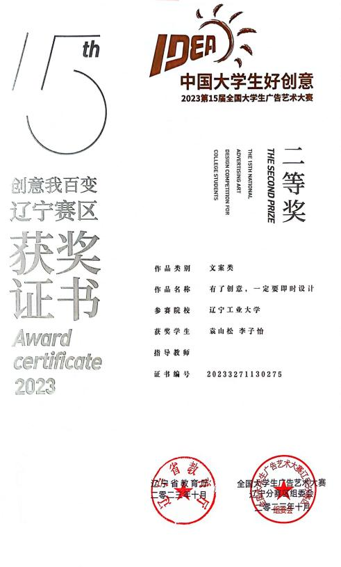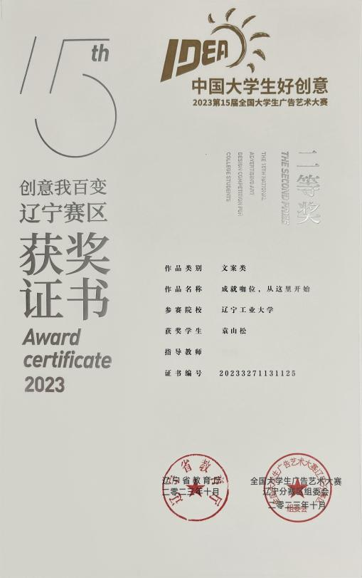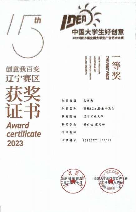 2.2022 年 9 月获辽宁省第八届 CFCC 智慧经济创新创业大赛省级一等奖;