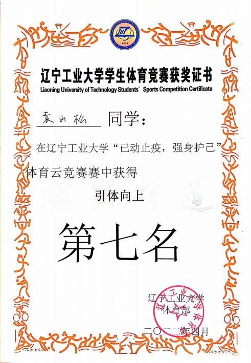 2022 年 4 月获williamhill官网体育云竞赛引体向上组第七名