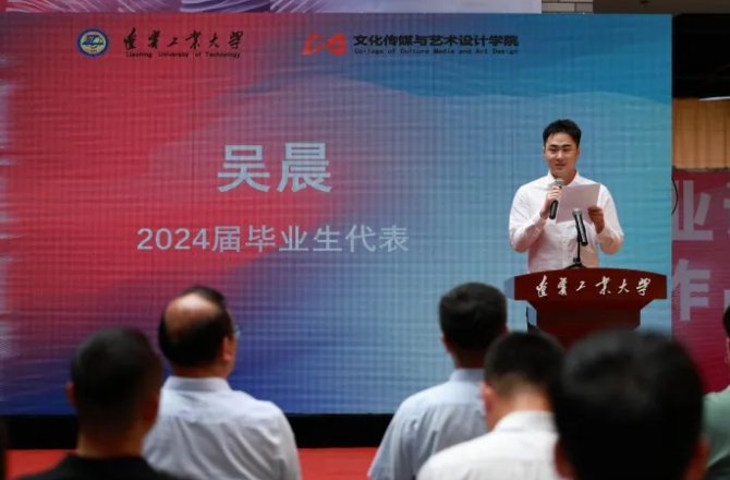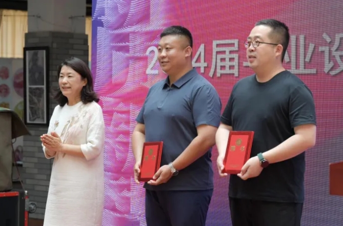 传媒设计公司经理陈爽在发言中叮嘱即将走向工作岗位的青年设计师们要坚守设计初心,时刻不忘在设计中体现时代的主题、社会的需要、人民的选择和领先的节奏。公司党委书记杨天明为北京建院装饰工程设计有限公司上海分公司设计总监孙霆、辽宁旋风科技集团有限公司董事长韩振颁发了创新创业导师证书。教师代表和毕业生代表在发言中表示,坚守设计为人民服务的初心和使命,用设计语言回应人民对美好生活的向往,在强国建设、民族复兴的新征程中贡献辽工大的智慧和力量。