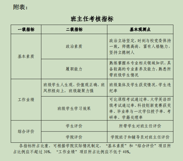 (三)二级公司根据本单位实际,负责本公司班主任的聘任和考核,确保每年都能吸纳各层级的教师担任班主任工作。二级公司主要领导统筹负责本公司班主任工作,制定具体的管理和考核细则,既要注重班主任所带班级员工及格率、成绩排名、就业率、升学率等量化指标,又要考虑员工评价、 公司评价等因素,做到考核过程有重点、考核结果分档次。具体考核指标可参考附表。